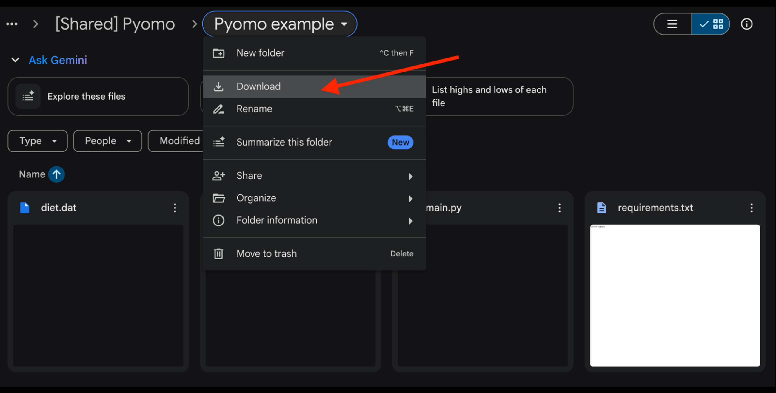 Get the project files. Download the files from the “Pyomo example” folder in Google Drive. (It’ll probably zip them up when you download the whole folder.)